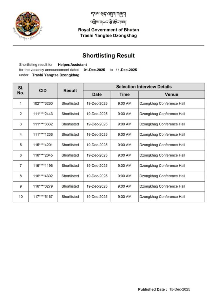 Helper/Assistant: https://jobs.rcsc.gov.bt/…/ShortlistingResult_4110_80.pdf
